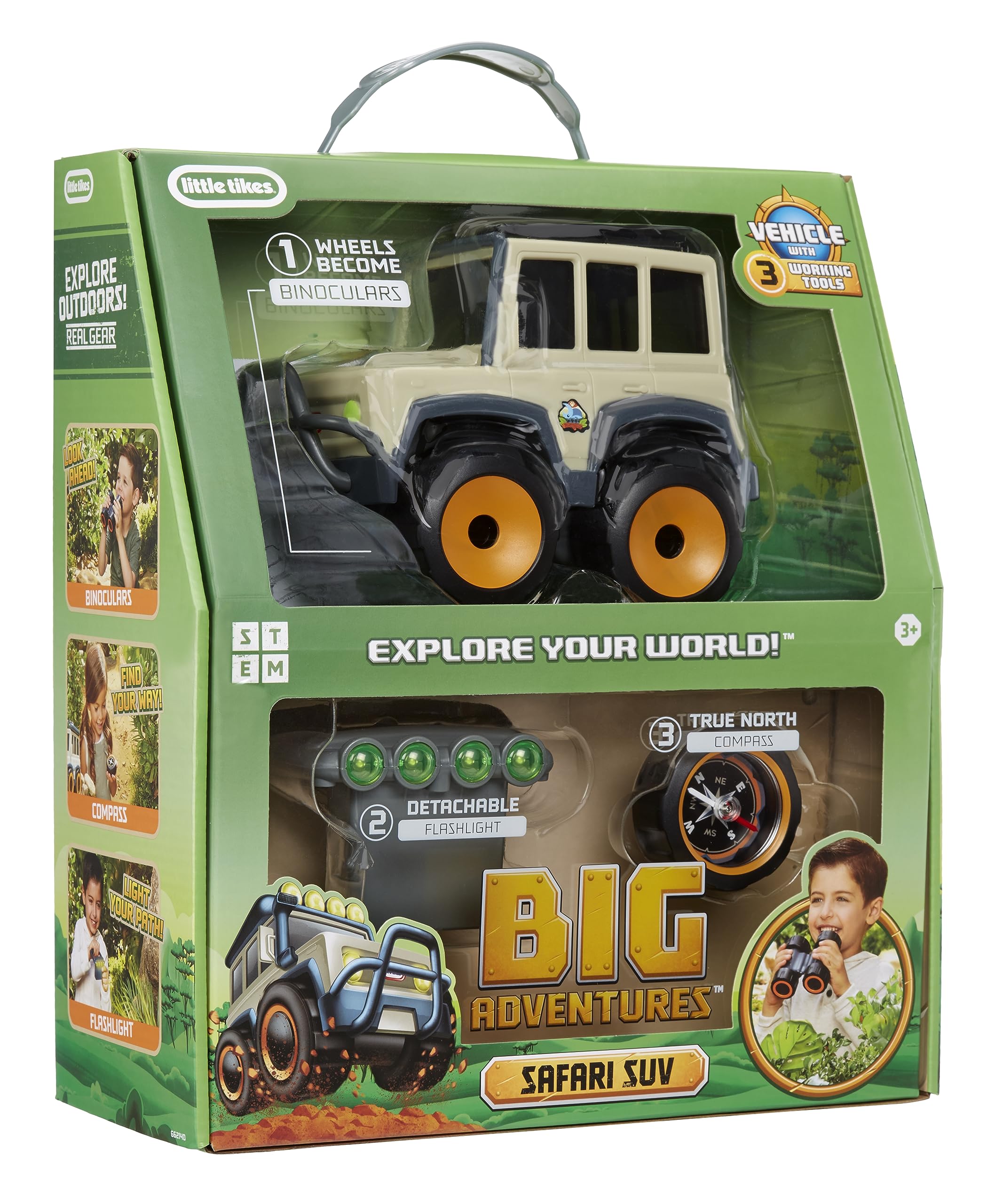 - RUGGED VEHICLES, REAL GEAR – Big Adventures toys combine play, fun and learning with real STEM related tools. This Binocular Searching Safari SUV truck includes three detachable tools: binoculars, flashlight and compass.